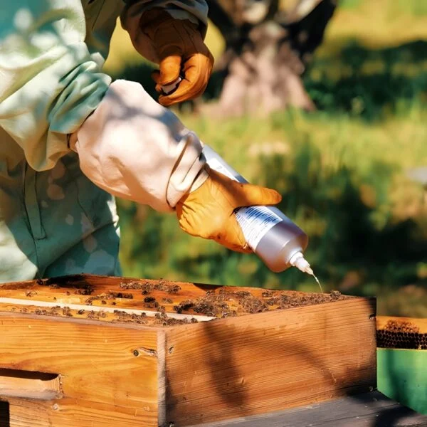 VarroMed® träufelst du direkt aus der Flasche zwischen die Wabengassen. Diese gebrauchsfertige Formulierung erspart dir aufwändiges Mischen oder Ansetzen. Führe die Behandlung am besten am späten Nachmittag oder Abend durch, wenn die meisten Bienen im Stock sind. So erreichst du die größtmögliche Wirkung gegen die Varroa-Milbe.